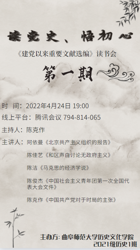 为积极响应学党史号召、充分认识到党的发展历程和丰功伟绩、领悟党的伟大领导核心作用、全面准确把我其思想精髓和核心要义,香港赛马会投注站 于4月24日晚举办读党史、悟初心读书会。本次读书会由张世慧老师指导,陈克作同学主持。