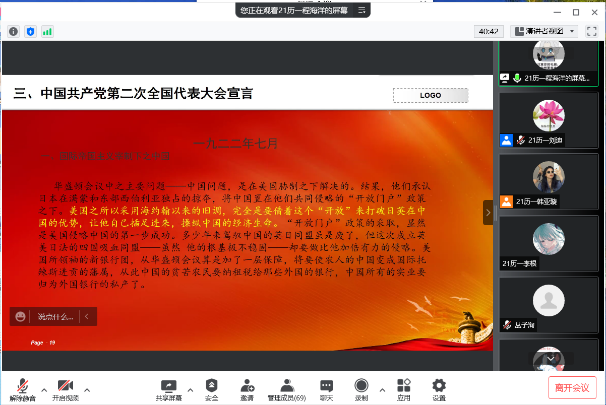 本次读书会围绕《建党以来重要文献选编》中的文章进行介绍,由五位同学通过PPT形式向同学们分享。五位同学分享结束后,在自由讨论环节中,同学们踊跃发言,谈论自己的阅读感悟或疑惑之处,之后由发言人和大家一起讨论解惑。