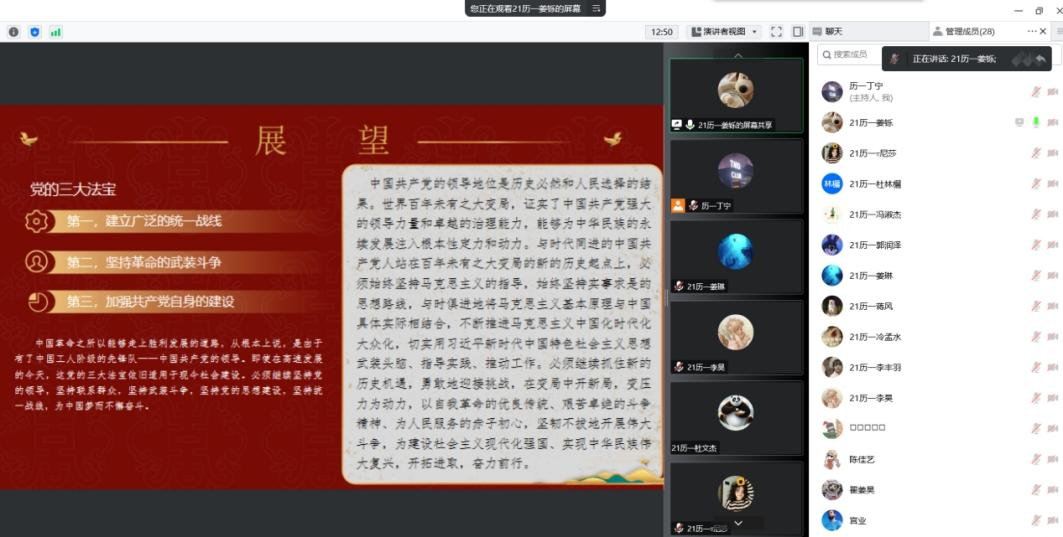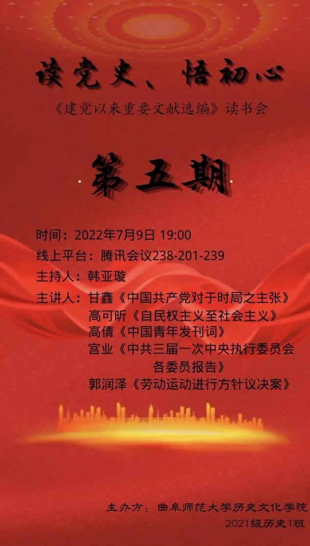 百年党史,需要我们每个人传承和赓续。为加强对中国共产党丰富精神内涵的理解,树立崇高理想,自觉把个人命运同祖国命运紧密联系起来,香港赛马会投注站 于7月9日晚举办读党史、悟初心活动,本次读书会由张世慧老师指导,韩亚璇同学主持。