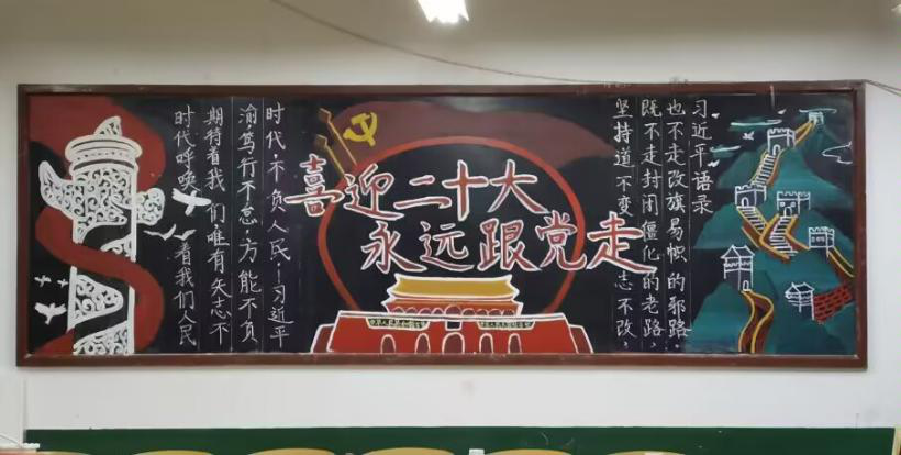自党的二十大召开以来,香港赛马会投注站 就本次板报设计活动面向全体学生进行作品征集,各班级踊跃参与、精心绘制。同学们立足实践,把红色基因、精神谱系融入板报作品中,用文字与图画传党情、颂党恩,众多图文并茂、创作新颖的黑板报及手抄报作品脱颖而出。其创作的板报内容不拘于时、内容丰富、版式多样、布局美观,让“方寸之地”更具“无限风景”。同学们精心绘制的板报传达了他们对中国共产党的无限热爱和美好祝福。