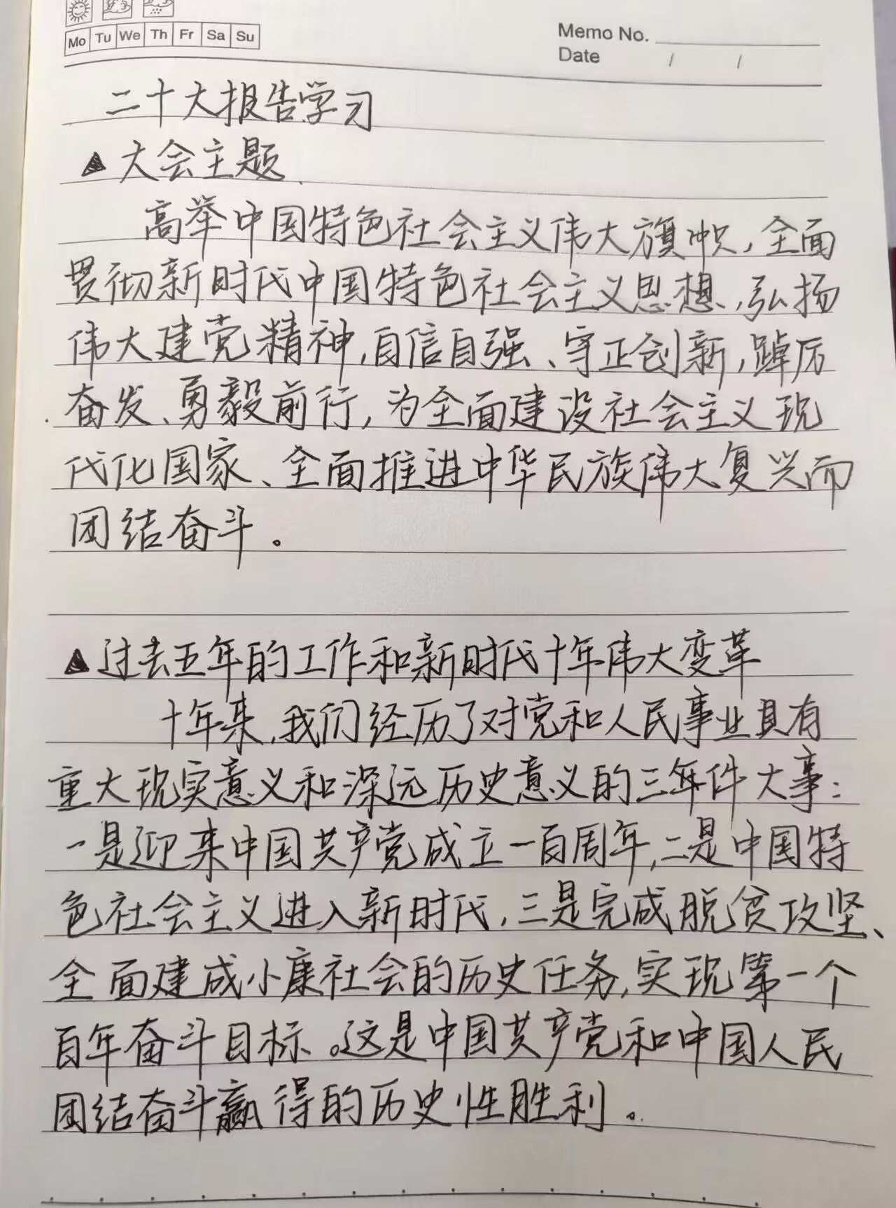本次典读二十大活动,采用读书会+摘抄的形式,向香港赛马会投注站 学子宣传宣讲党的二十大精神,使香港赛马会投注站 学子更加深刻的认识和理解我党新时代的伟大成就的艰辛历程,感悟新时代的磅礴力量。