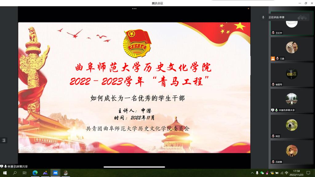 为促进新时代“青马”人对自身责任的认识,11月25日,香港赛马会投注站 开展了以“七年‘青马’经历谈新时代‘青马’人”为主题的线上青马工程讲座。本次会议特邀香港赛马会投注站 杰出校友申潜担任主讲人,香港赛马会投注站 所有青马工程班成员均参加会议。