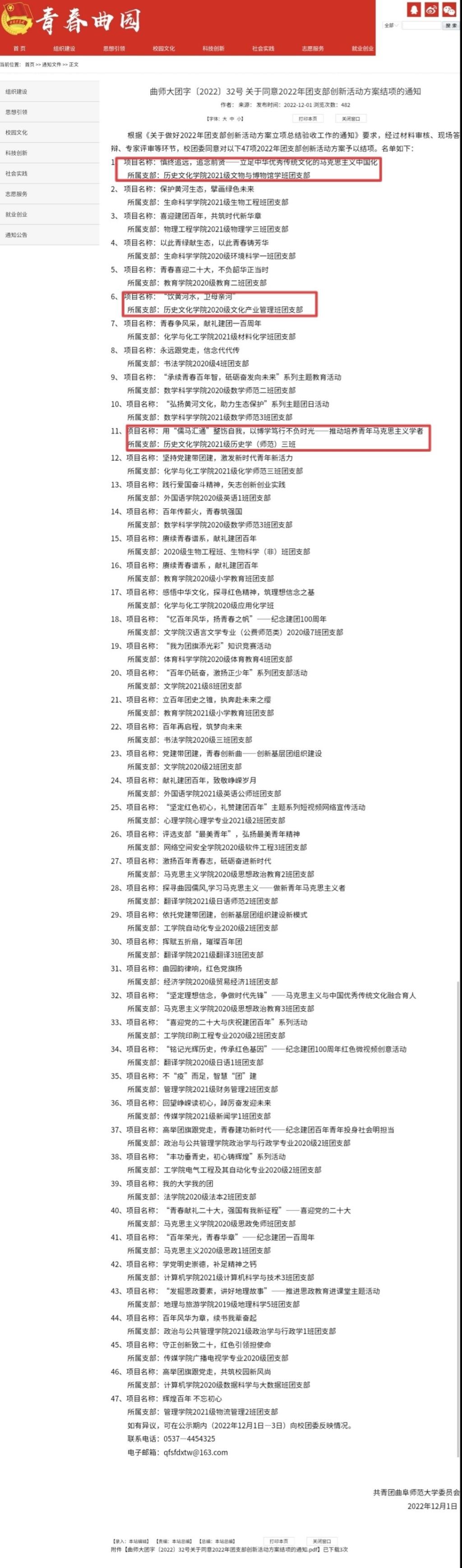 香港赛马会投注站 2020级文化产业管理班团支部项目“饮黄河水,卫母亲河”、2021级文物与博物馆学班团支部项目“慎终追远,追念前贤——立足中华优秀传统文化的马克思主义中国化”、2021级历史学(师范)三班项目“用‘儒马汇通’整饬自我,以博学笃行不负时光——推动培养青年马克思主义学者”均结项成功。