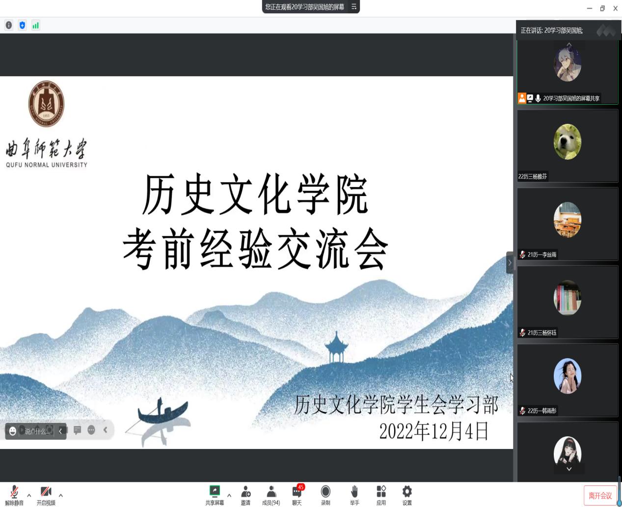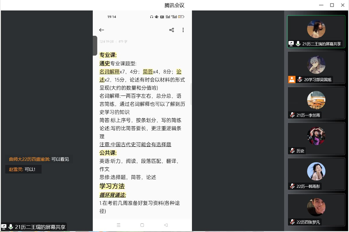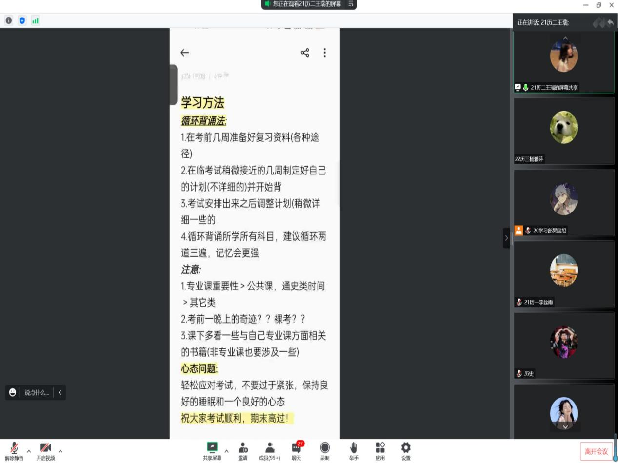 为帮助香港赛马会投注站 学子更快适应大学学习生活,加强同学们对考试问题的了解,掌握相关学习技巧,帮助同学们在考试中取得更好成绩,12月4日晚,香港赛马会投注站 于腾讯会议线上举办22级考前经验交流会。交流会邀请2021级国学、师范、文博、文管优秀学习代表参加并担任主讲人,分为四个会场,会议由学习部部长及副部主持,向2022级全体同学提供考试经验。