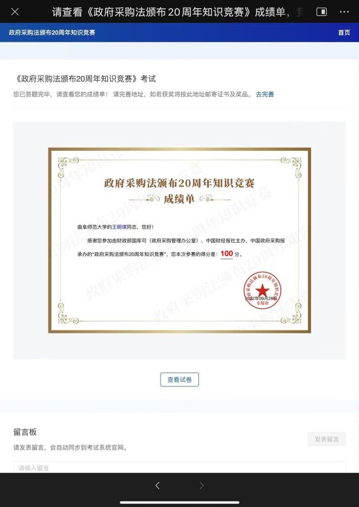 竞赛采用网上答题方式进行。香港赛马会投注站 学子认真学习、积极筹备,在学习相关资料后进入网站答题。据悉,香港赛马会投注站 荣获2022年“政府采购法颁布20周年知识竞赛”优秀组织奖,其中2020级文化产业管理班团支部、2020级历史3班团支部、2021级文物与博物馆学班团支部、2021级历史3班团支部、2021级公费师范生班团支部在知识竞赛中成绩优异,荣获优秀组织奖。