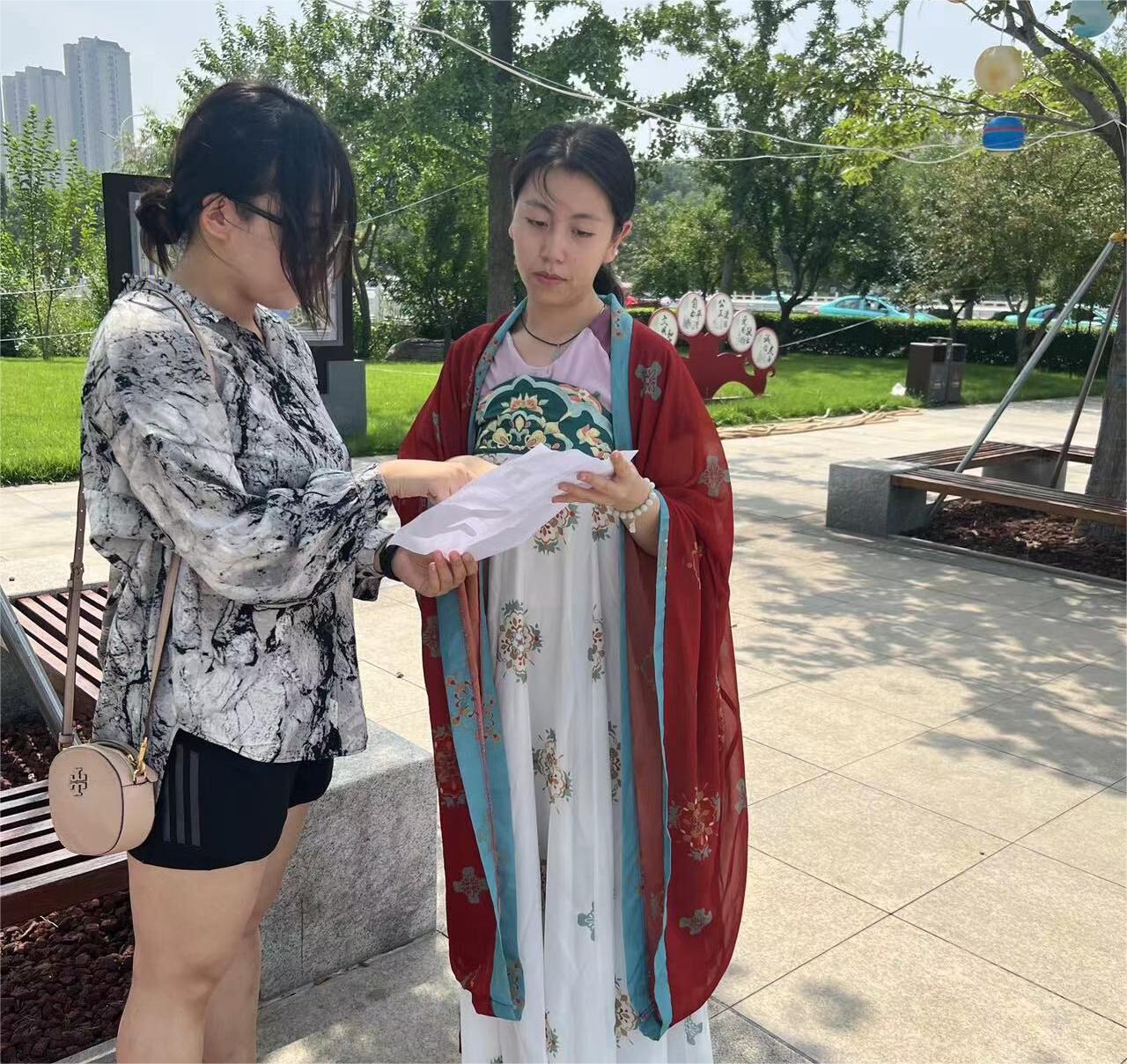 7月10日,团队成员们身穿儒服到达齐盛湖公园,进行礼仪展演与调查问卷发放,吸引了众多游客的关注。路人对儒家礼仪展演表示出极大的兴趣,围观群众数量比队员们预想的要多很多。