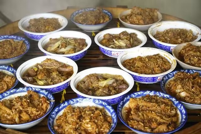 “传统的曹县蒸碗主要有蒸蹄子、蒸黄牛肉、蒸山羊肉、蒸素鸡、蒸鸳鸯蛋、蒸扣肉、蒸土鸡、蒸卷煎、蒸排骨、蒸米粉肉、梅菜扣肉、蒸草鱼、四喜丸子、蒸面子鸡、虎皮鸡蛋、蒸甜米等20几个品种。”王杰师傅说,曹县蒸碗已经流传几百年,一开始是为解决祭祀过后剩下来的食材,而探索出的一种烹饪方法,后来经过不断演变,最终形成了现如今曹县蒸碗这一美食形态。