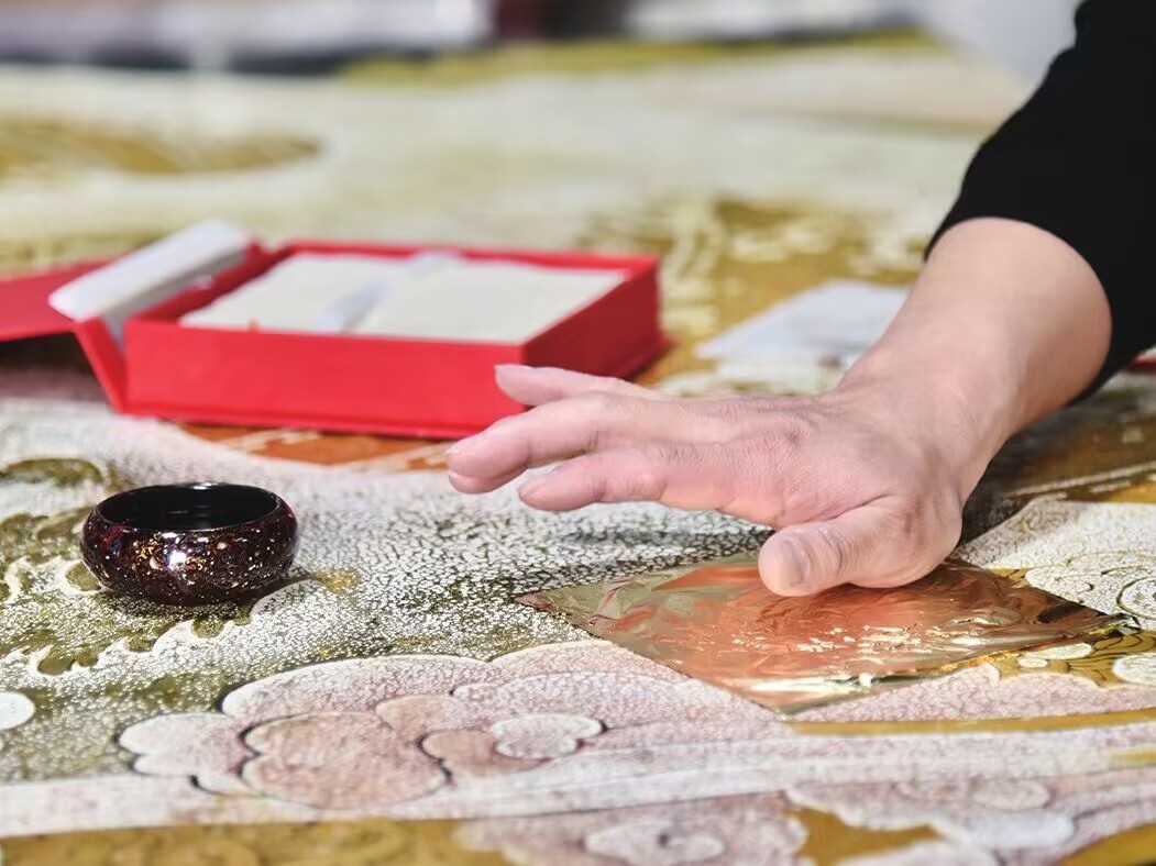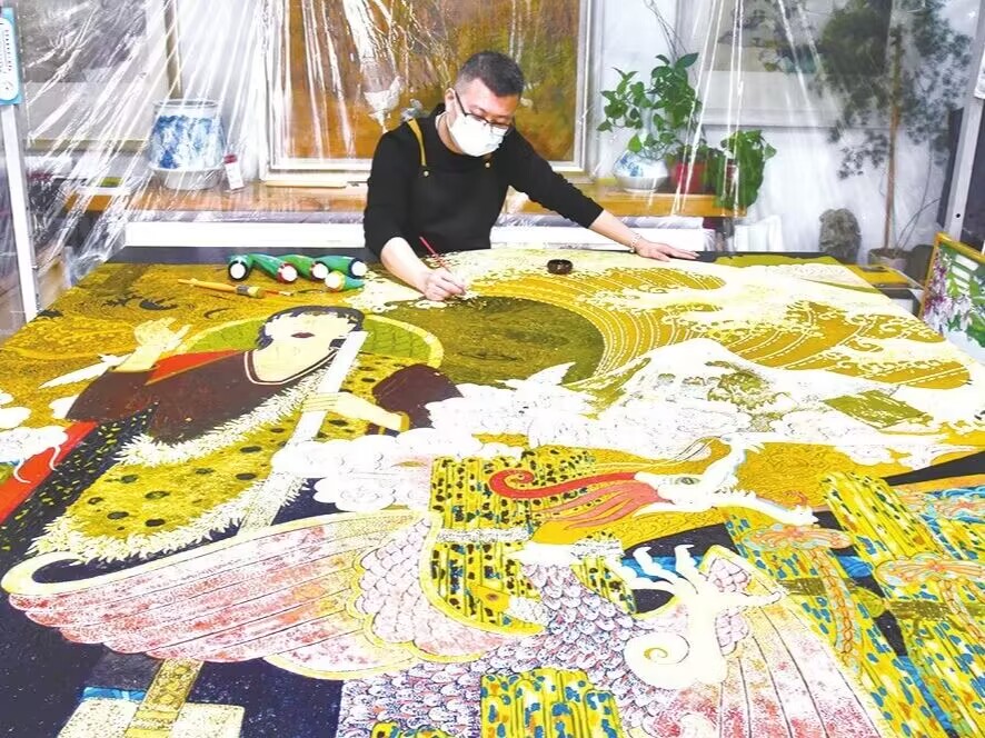 德州有一位匠人,他潜心漆画创作10多年,蛋壳、螺钿片、金银箔等小物件,经过涂漆研磨、刀刻雕琢,在他的手里实现了华丽变身。为了找到他,我们来到了德州市天衢新区董子文化街,靠着向街道老乡的打听,我们找到了姚向东师傅的家和工作室。今年45岁的姚向东是德州经济技术开发区区级非遗漆画传承人,一踏入工作室,大漆独有的气味扑面而来,充斥着整个房间,环顾四周,漆画作品让人应接不暇。在一幅硕大的画作前,全神贯注的姚向东正在进行色漆髹涂环节,细小的笔尖在作品上反复变涂,还不时地俯下身仔细观察上色情况。“这幅5平方米的漆画作品名为《治黄首役》,讲述的是大禹治水的神话故事。”在作画的同时,姚向东告诉我们,这幅作品制作过程十分繁琐,仅贴蛋壳的制作环节就用掉了近3.5公斤鸡蛋壳,耗时三个多月的时间。不仅是这幅作品,每一幅漆画从构思到完成整个过程都十分漫长。姚向东说,创作一幅漆画除前期的构思外,还要经过描稿、堆漆和贴蛋壳等几十道复杂工序,每一步都非常考验创作者的手法和耐心,而且很多步骤还需要满足特定的环境条件,尤其是打磨环节,更是十分磨人。姚向东坦言,“漆是磨人的,人也是磨漆的,做漆画就是一种修行,这就是我所认为的工匠精神,每一处细节都要经过反复研磨锤炼,要经过时间的考验和打磨。”是啊,漆艺的每一笔,皆精致细腻,匠人将思绪、故事、精神都通过笔触,传递到漆画上,无论是花鸟工笔、亭台楼阁,还是小桥流水,都蕴藏着对中国文化的凝聚和传承。