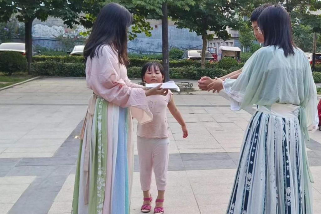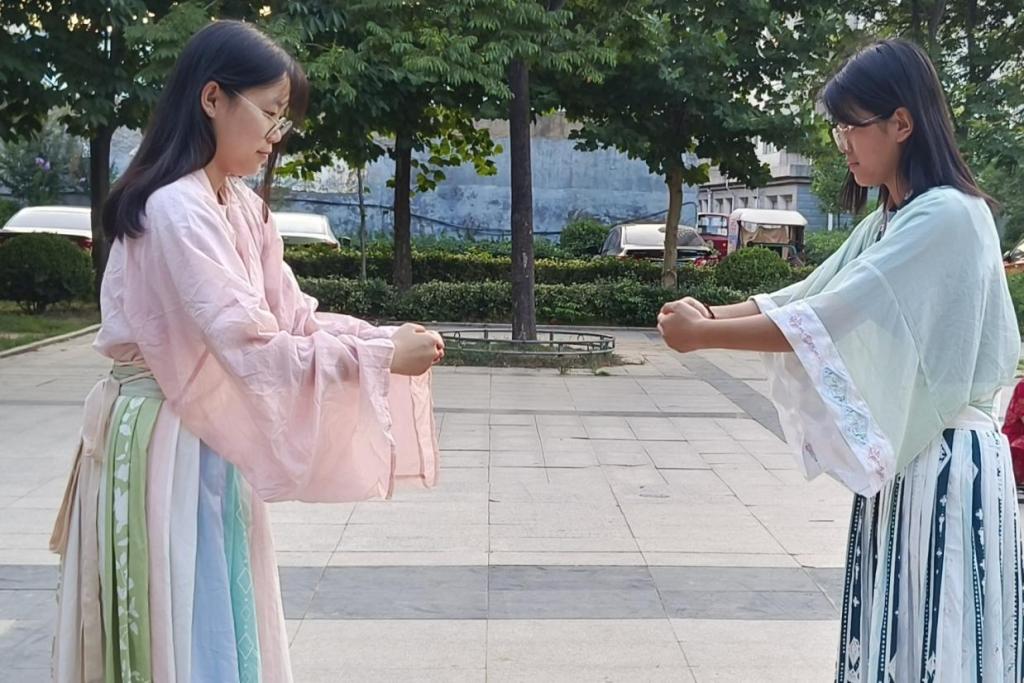 《论语》讲到“君子敬而无失,与人恭而有礼。四海之内,皆兄弟也”。拱手礼作为一种能体现国人人文精神的交往礼仪,散发着浓郁的东方典雅气息,在拱手揖让之间,反映着古人所提倡的讲礼守礼的礼俗观念,长幼有序、恭敬谦让的传统美德,以及与人为善、互敬互重的交际理念。有鉴于此,实践队员选择以古代拱手礼为展演主要内容,经过多轮排练,实践队员们向观众们展示了古礼风韵,并以端正认真的态度收获了市民们的一致好评。