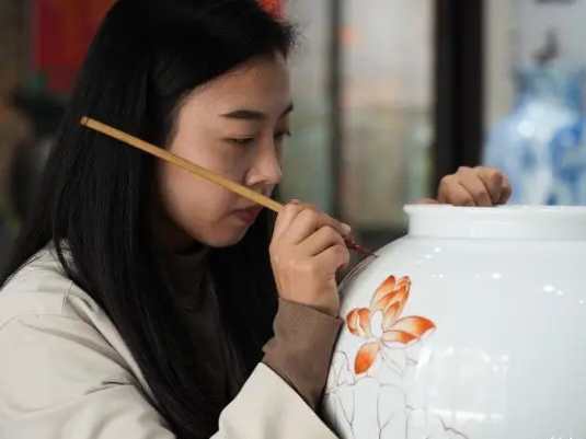 大运河旁,德州红绿彩陶瓷博物馆古色古香,巍然耸立。12日上午,我们跟随博物馆负责人刘宇的脚步,走进了博物馆内部。穿着龙纹中式长裙、手姿优美、面目清秀的瓷美人系列作品映入眼帘,“大红”对“大绿”,色彩对比十分之强烈却并不令人觉得突兀,反而相得益彰。“红绿彩瓷器主色以红、绿为主,用色大胆,艳而不俗,它的出现,相当于黑白电视机变成了彩色电视机,为之后的斗彩、五彩奠定了基础”,刘宇随之介绍着,德州窑红绿彩瓷器与我们更经常接触到的“青花瓷”等不同,给我们实践队员留下了“配色十分特别”的第一印象。继续深入博物馆内部,《一路莲升》《盛世荷香》《风华绝代》……一件件精美瓷器熠熠生辉。通过刘宇的讲解,我们了解到,红绿彩是在1300摄氏度高温烧造而成的白胎上,用笔蘸取矾红、明绿、鹅黄等彩料勾画出纹饰,再入窑800摄氏度左右的低温烧成,属于二次烧制,因此要求画师具有非常精细的手工上色技艺。