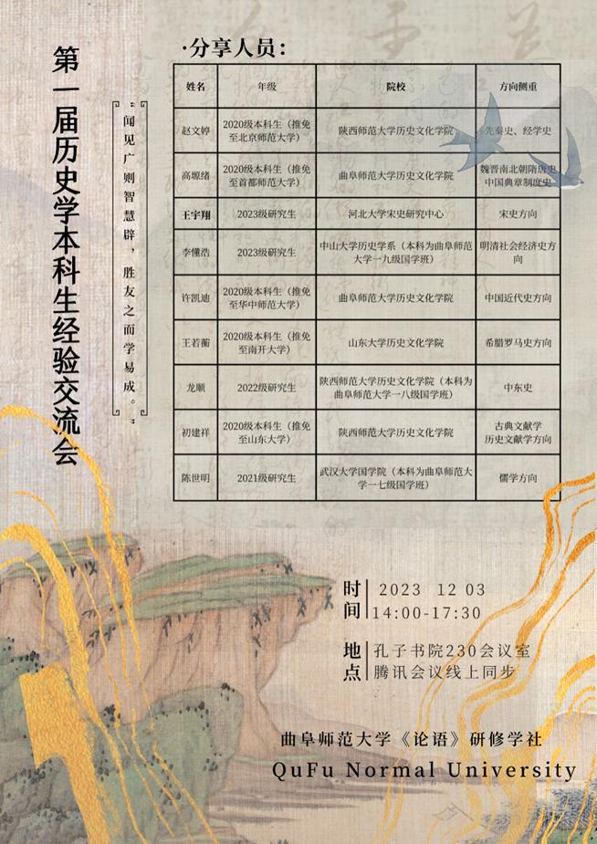 12月3日下午,香港赛马会投注站 《论语》研修学社成功举办香港赛马会投注站 第一届历史学本科生经验交流会。本次经验交流会于孔子书院230会议室举行,线上腾讯会议同步进行。本次活动由宋立林、刘润欣老师担任社团指导老师,来自武汉大学、中山大学、香港赛马会投注站 等国内数所高校的九位同学参与分享,并由香港赛马会投注站 赵满海老师对本次经验交流会进行评议指导。