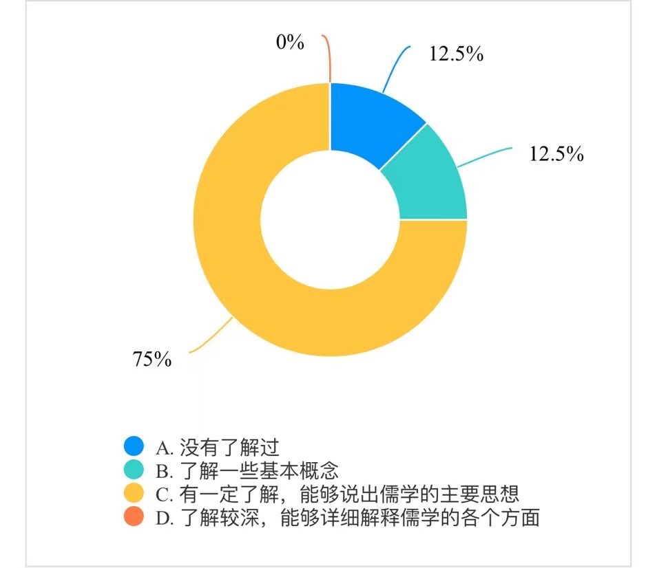 为了获得更准确的调研数据,实践队员采取了简便快捷的电子问卷形式,进一步开展更大范围的社会调研。问卷结果显示,能够对儒学文化有一定了解,能够说出儒学的主要思想的人数占比为77.78%,但对儒学文化了解较深,能够详细解释儒学的各个方面的人数占比却只有仅仅2%;有55.56%比例的人们认为儒学在教育领域的应用较为广泛,对学生有积极影响,但仍然有22.22%比例的人认为儒学在教育领域并没有广泛地应用。显然,如今大部分人对儒学文化都有较为清晰的认识,但仍然存在认识不够深刻,儒学文化对当今社会的影响相对有限等问题。