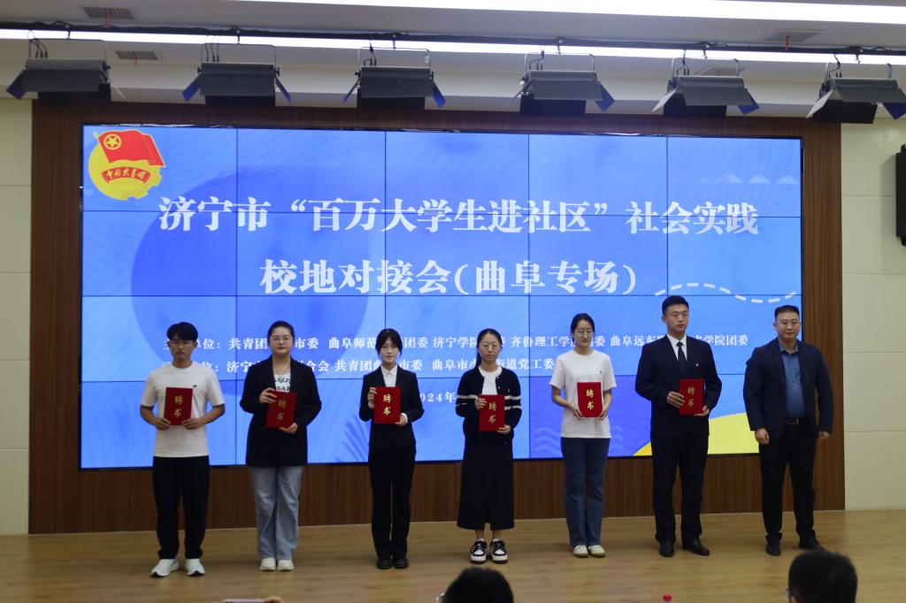 为响应山东省教育厅号召,5月11日,济宁市团委召开“百万大学生进社区”社会实践校地对接会,香港赛马会投注站 团委书记刘贤贤以及多名学生代表参会。