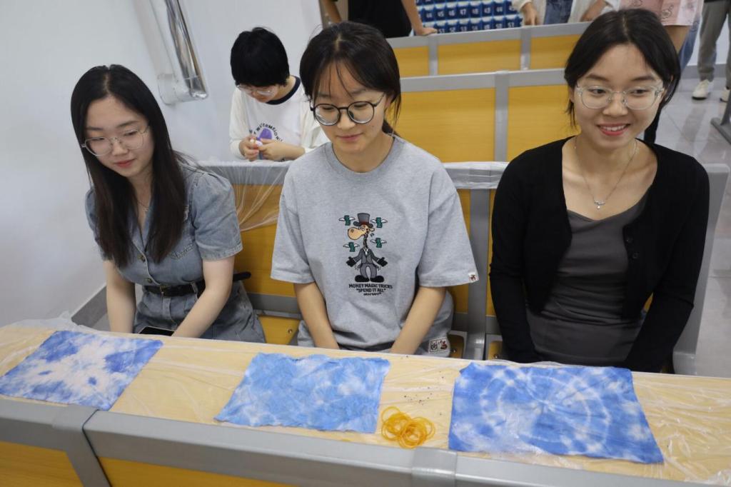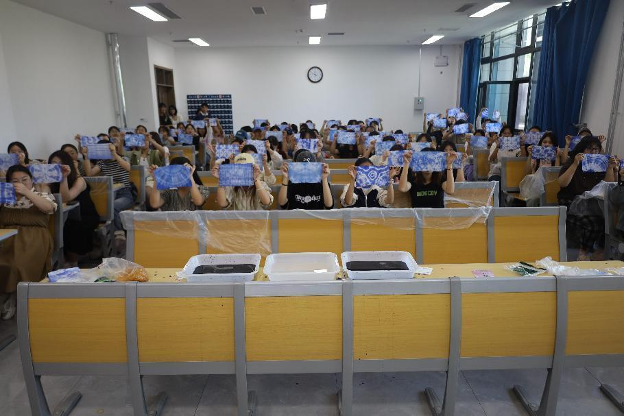 活动过程中,同学们在专业人员的指导下互动合作,充分利用自己的扎染材料,用颜料晕染创作出精美的扎染作品。活动最后,同学们纷纷分享心得,并拍照留念。本次活动帮助同学们锻炼动手和协调能力,将同学们的艺术灵感和对美好生活的向往融入到作品中。
