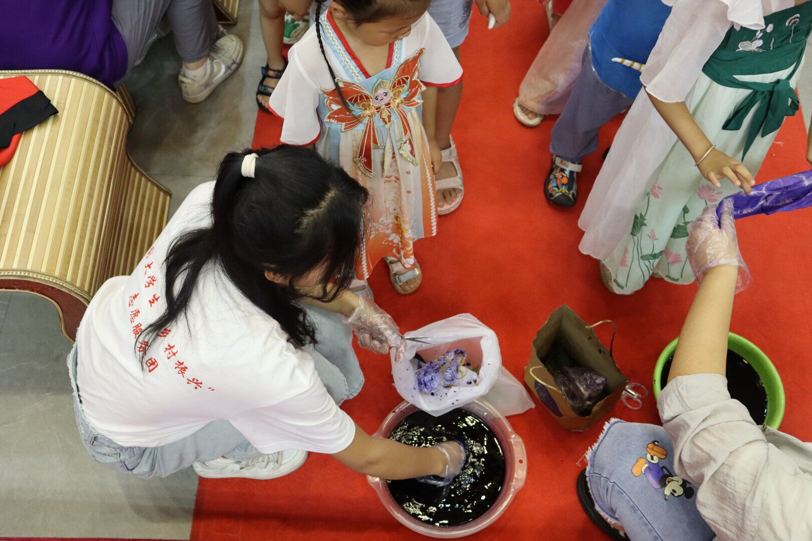 扎染,这一源自千年的汉族民间瑰宝,古称扎缬、绞缬,以其独特的防染工艺在历史长河中熠熠生辉。活动筹备之际,为确保此次非遗文化传播活动能够圆满成功,实践队员们进行了周密而细致的准备工作。通过精细分工,每位队员都肩负起了不可或缺的责任。在物资筹备方面,实践队员们精心挑选了高质量的颜料与布料,确保每一件手工艺品都能呈现出最佳的艺术效果。同时,为了确保活动过程中的扎染环节顺利进行,实践队员们提前进行了深入的学习与研究。他们不仅详细了解了扎染的历史背景与制作工艺,还亲自动手试验了多个扎染步骤,不断调整与优化,力求将最精准、最生动的扎染技艺呈现给社区居民。