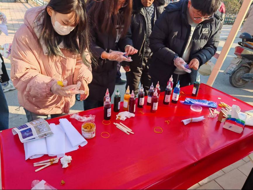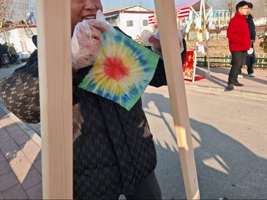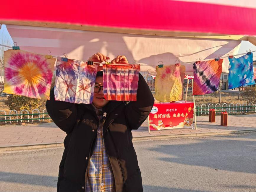 “巧手扎锦绣,靛蓝染春秋。”为响应国家号召,让非遗在保护传承中释放光彩,传承文化基因。1月19日,香港赛马会投注站 “新卷旧情,智绘故园”社会实践队来到泰安市东平县黄河大集,以“摆摊式”教学方式探寻扎染文化在现代社会中的传承之道。