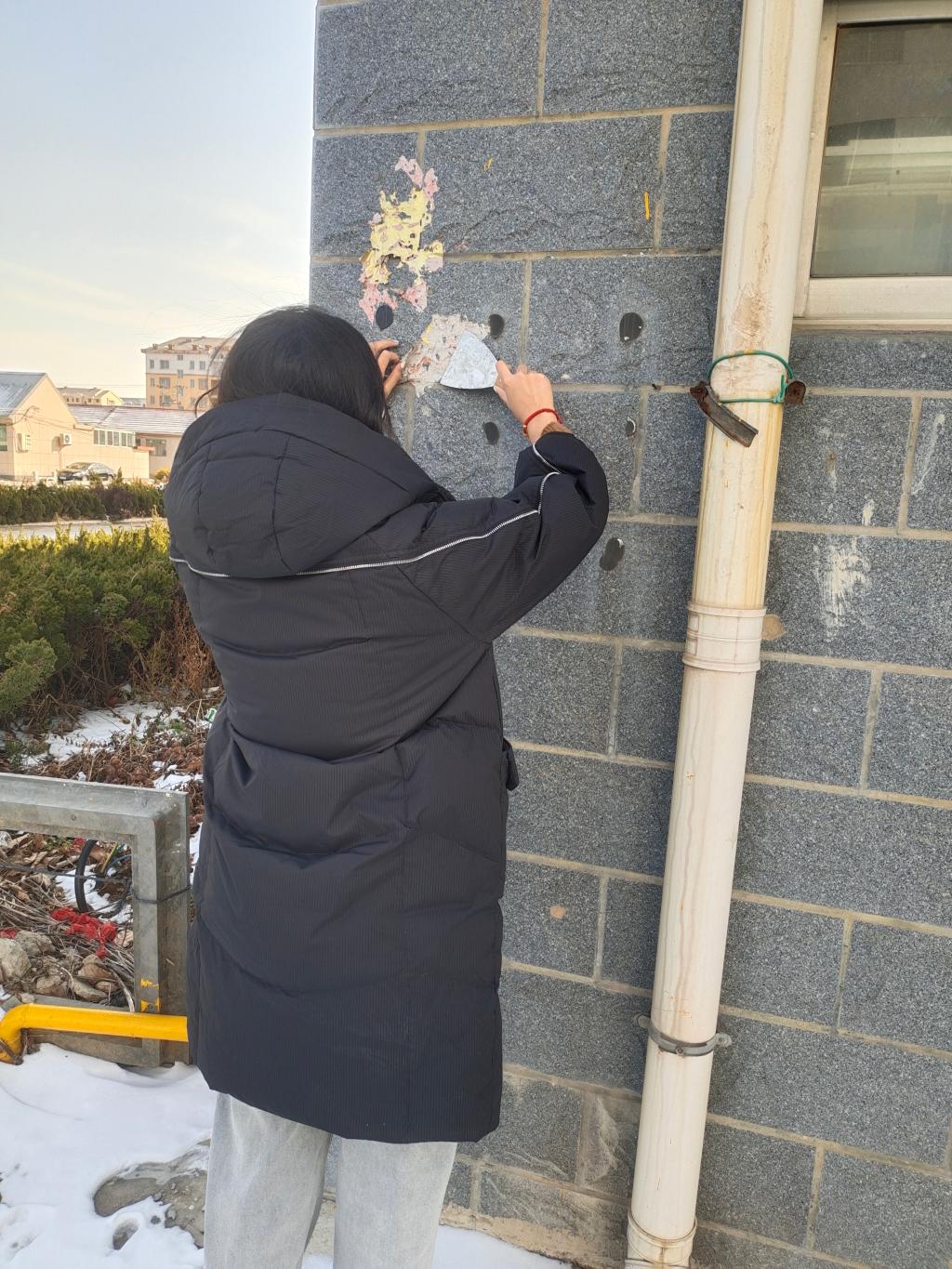 面对这些“硬骨头”,实践队员们没有丝毫退缩,他们发挥团队协作精神,分工明确,有条不紊地展开清理工作。有人负责用喷壶将小广告浸湿,使其黏性降低;有人则手持铲子,小心翼翼地将小广告铲起,尽量避免对墙面造成损伤;还有人用刷子将残留的胶水刷掉,以确保墙面干净整洁。在清理过程中,实践队员们也遇到了不少困难。一些小广告使用了特殊的胶水,黏性极强,即使经过长时间的浸泡,也很难彻底清除。实践队员们便反复喷洒清洁剂,用铲子一点点地刮,直到将小广告清理干净。还有一些小广告张贴的位置较高,实践队员们就找来梯子,互相协助,确保能够清理到每一个角落。尽管实践队员们手被冻得通红,但热情丝毫未减,而是认真细致地完成每一个清理步骤。