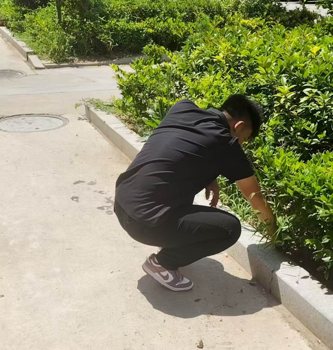 社区的花坛本是居民休闲赏景的好去处,但由于夏季雨水充足,杂草疯长,不仅挤占了花卉的生长空间,还让花坛显得杂乱无章。实践队员目标是清除杂草、修剪枝叶,让社区的“绿色名片”重新焕发光彩。花坛里的杂草长得又高又密,里面还藏着蚊虫和碎石。实践队员戴上手套,蹲在地上一点点清理:拔除杂草,把拔下来的杂草装进垃圾袋,避免种子掉落;修剪冬青等花木的枯枝败叶,让植株形态更整齐;除了清理杂草,实践队员还在社区的指导下,补种了一些耐阴的绿萝和鲜艳的太阳花。当最后一片花坛清理完毕,看着原本杂乱的草丛变成整齐的绿地,五颜六色的花朵在风中摇曳,大家都露出了欣慰的笑容。傍晚时分,不少居民来到花坛边散步,指着新开的花说:“这花真好看,小区里一下子有了夏天的样子!”