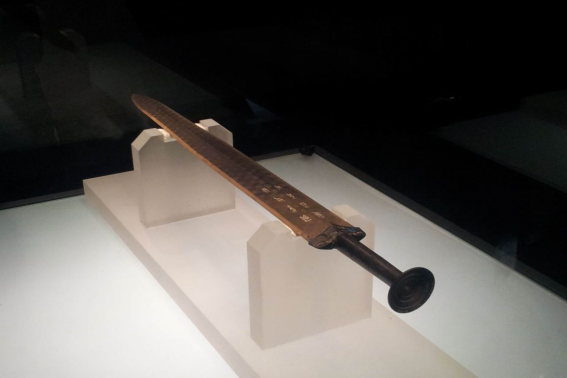 在“越王勾践剑特展”展厅,一件件精美绝伦的文物叙述着楚国的历史沉浮。当寒光凛冽的剑身映入眼帘时,队员们不禁屏住呼吸。越王勾践剑出土于1965年,虽历经2500余年,却依旧锋利如新,剑身布满精美的黑色菱形暗纹,近剑格处刻有“越王鸠浅(勾践)自作用剑”八字鸟篆铭文。越王勾践剑,千年时光未能磨灭其寒光闪闪,锋利如初,剑身上的菱形暗格纹饰与鸟篆铭文,体现了越国铸剑工艺的卓越。越王勾践剑不仅是吴越争霸的历史见证,更承载着“卧薪尝胆”的精神内涵。细赏剑身纹理,仿佛触摸到了历史的波澜壮阔。旁边的彩漆木雕座屏,以其高超的雕刻技艺和独特的造型,令人赞叹不已。屏上动物栩栩如生,织就了一幅鲜活的神话图景,彰显了楚文化的深厚底蕴与浪漫风采。