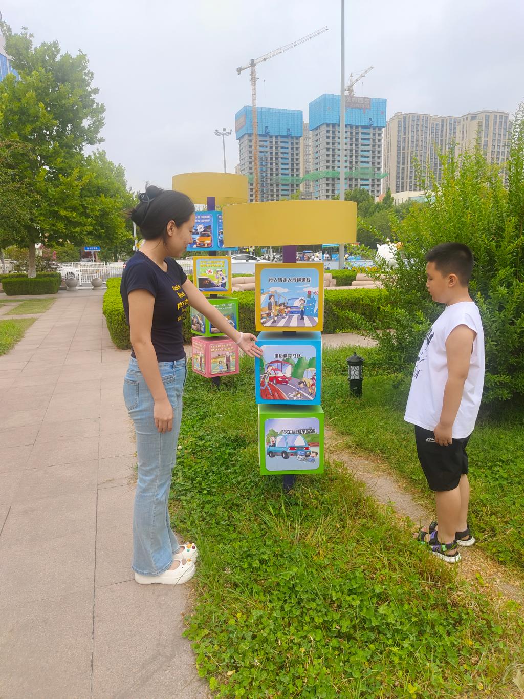 广场地面上的标线与展览板上的标识相互对应,实践队员们指着地面的斑马线,让小朋友们对照展览板上的人行横道标志,加深对标识含义的理解。一名队员站在展览板前,逐一向孩子们讲解每个标识的作用,不时有小朋友指着展览板上的图案,提出自己的疑问,实践队员们都耐心地一一解答。