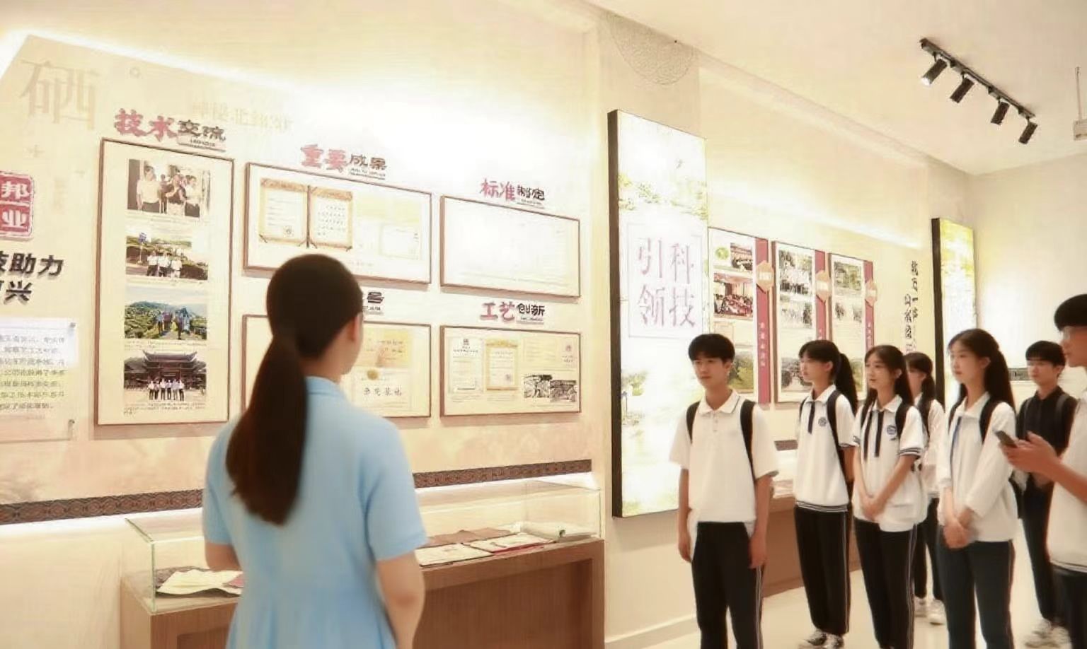 踏入博物馆,实践队员们即刻投入到有序的参观调研。在陈列着历史资料与成果的展区,他们驻足凝视,那些记录恩施玉露发展历程的图片、见证技术交流与成果突破的文献,都成为队员们探寻非遗脉络的线索。从 “技术交流” 展板里,追溯传统制茶技艺与现代理念碰撞的过往;在 “重要成果” 展示中,明晰恩施玉露在品质提升、产业助力方面的贡献。实践队员们认真梳理这些信息,尝试从历史传承的维度,理解非遗文化如何在岁月积淀中成为地方名片,也思索怎样将这份厚重的文化底蕴转化为教育资源,为创新教育实践提供滋养。
