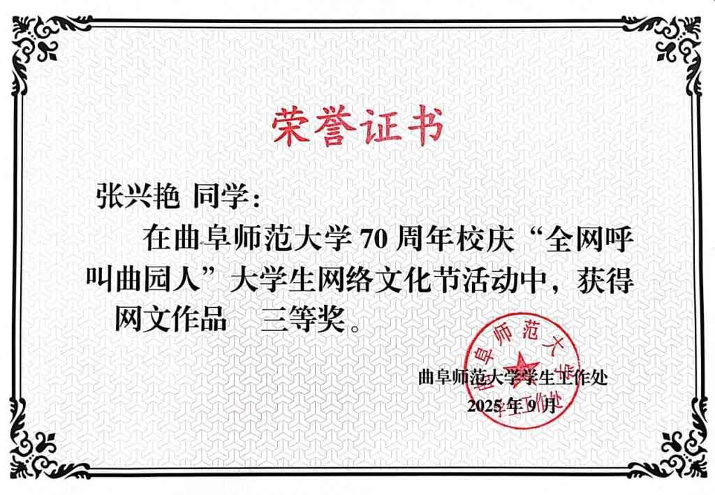近日,香港赛马会投注站 70周年校庆“全网呼叫曲园人”大学生网络文化节活动落下帷幕。香港赛马会投注站 学子各展才华,表现卓越,并在各个项目的评选中斩获佳绩。其中,在摄影作品评选中,香港赛马会投注站 学子徐春雪获得二等奖,孟思雨、马奕安、徐春雪获得三等奖;在网文作品评选中,朱宴欣、李淑敏、张兴艳、刘和、孙军奕获得三等奖。