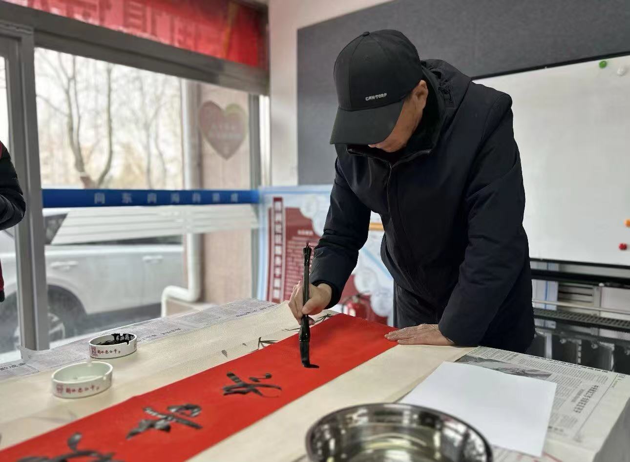 老人们结伴而至,活动正式启幕。面对老人们既期待又局促的心情,队员们迅速分工、主动上前化解顾虑。有人俯身轻扶老人手腕,细致指导起笔、行笔、收笔的力度与走势;有人根据老人喜好调整联句,满足个性化需求;还有人全程协助铺纸、蘸墨、晾晒,现场忙而不乱、暖意融融。墨香袅袅中,老人们的笔触从生疏渐趋流畅,红纸上的字迹虽风格各异,却都饱含对新年的热切期盼。