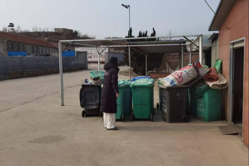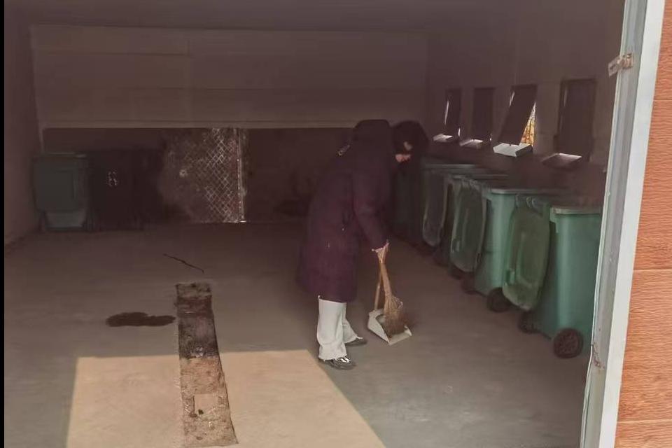 上午十点,村民投放高峰过后,队员们开始了第二项工作——清扫收集房后的转运间。推开厚重的卷帘门,一股混杂着尘土和消毒水的气息扑面而来。队员们拿起扫帚,从墙角开始细致清扫,地面上残留的菜叶碎屑、纸屑被一点点归拢到簸箕里。转运间里整齐排列着十余只绿色垃圾桶,每一只都对应着收集房里的投放口。队员们一边清扫,一边检查桶身是否有破损,当发现有一只桶的轮子卡了石子,便蹲下身用树枝一点点将石子抠出,确保后续转运时不会卡顿。清扫完毕后,又仔细擦拭了每一个垃圾桶的外壁,让原本蒙尘的桶身重新焕发出干净的色泽。