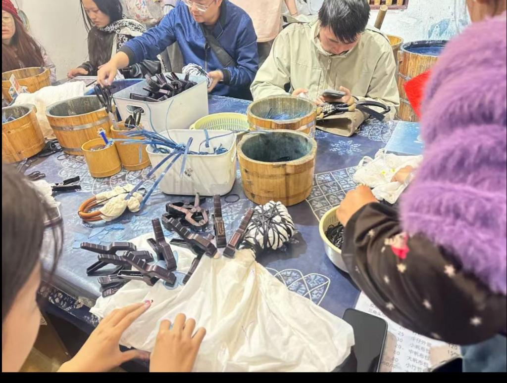 社区活动室内,队员们提前布置场地,铺展素白棉布、准备板蓝根染料与各式扎结工具,营造出色彩清雅、氛围温馨的体验环境。队员们引导社区成员有序入座,并全程协助非遗讲解员开展教学。