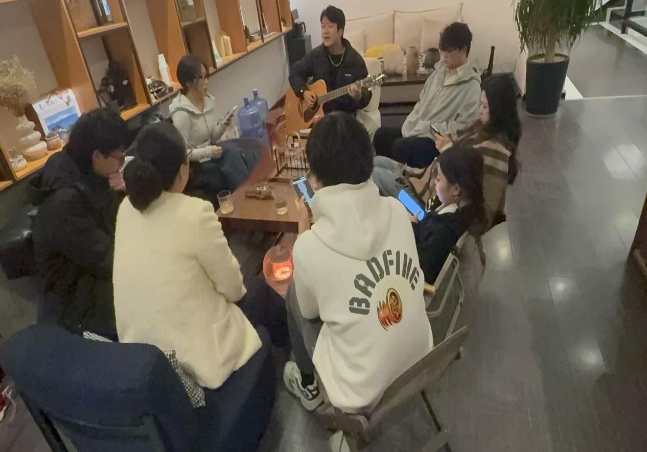 活动尾声,队员们弹起吉他,带领居民哼唱云南本土民谣与经典社区歌曲,主动邀请居民加入合唱,大家或坐或站,手抚节拍,声渐融合。从《小河淌水》到《邻里之间》,歌声轻柔而真挚,队员们与居民并肩而坐,跟随旋律轻轻摇摆,眼中含笑。