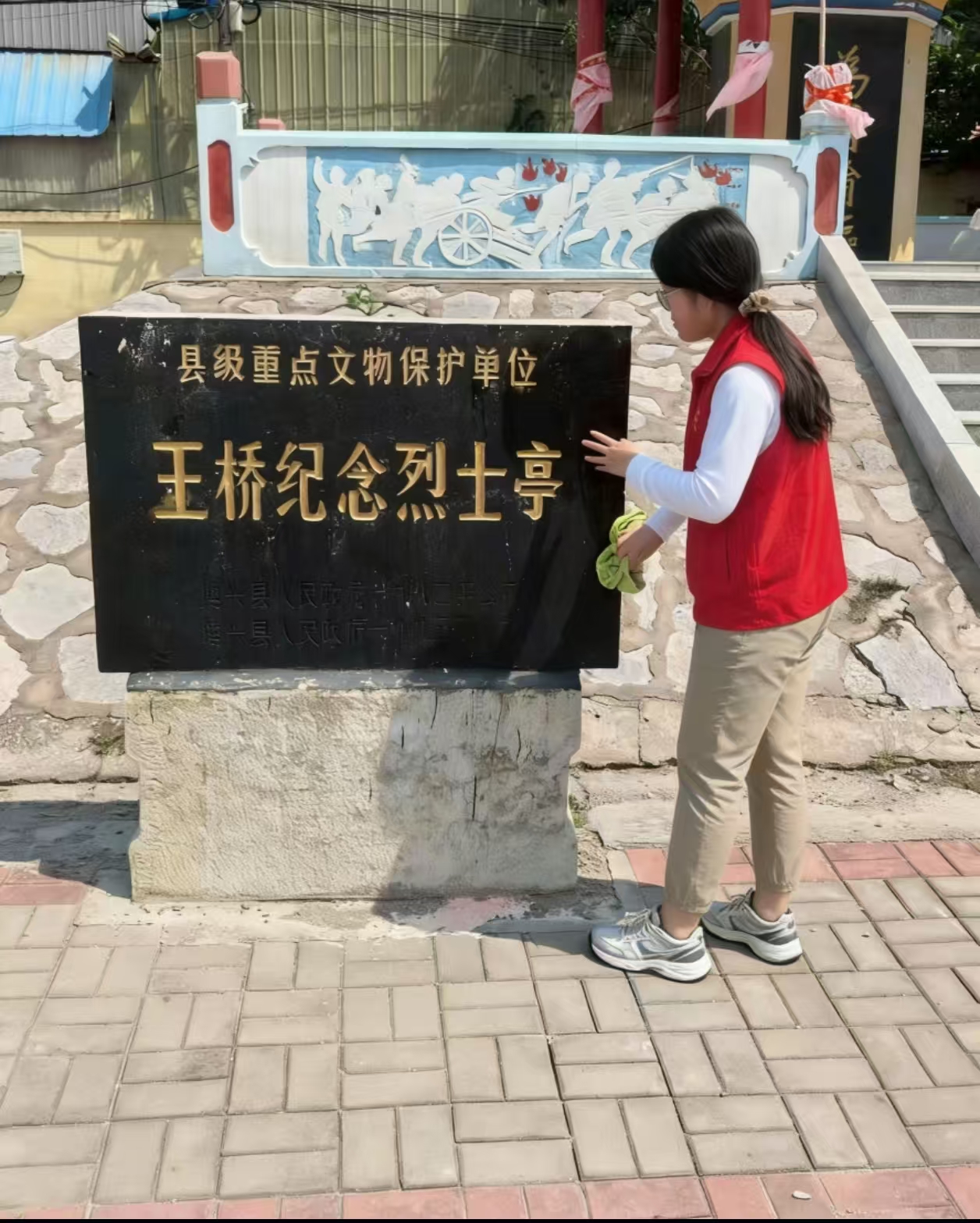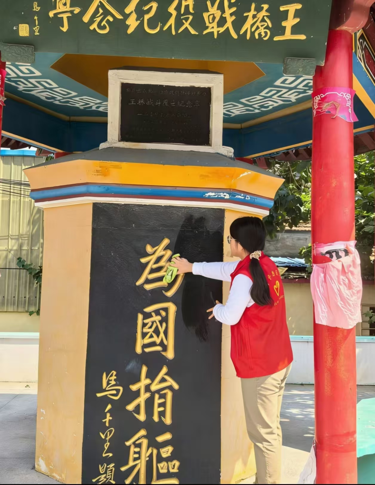 当日,志愿者们手持清洁工具,怀着无比崇敬的心情,对烈士纪念亭的碑体、基座、栏杆及周边环境进行了全面、细致的擦拭和清扫。整个过程肃穆有序,志愿者们动作认真专注,小心翼翼拂去积尘与落叶,让整座纪念设施焕发庄重肃穆的光彩。这不仅仅是一次简单的劳动服务,更是一堂无声的、深刻的思想教育课,是对先烈表达缅怀之情最直接、最质朴的方式。