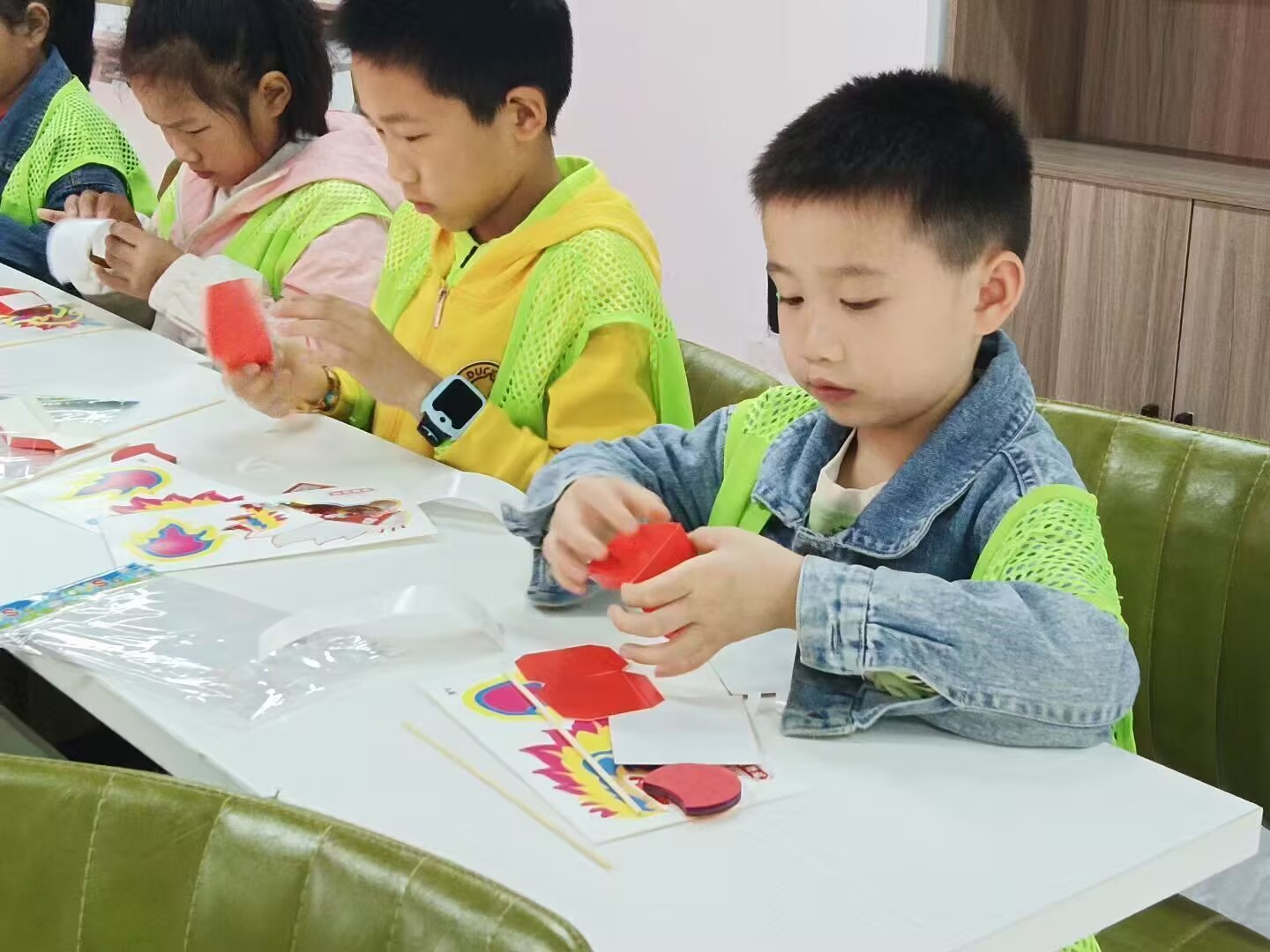 科普宣讲结束后,活动进入手工制作环节。实践队提前准备了裁剪整齐的彩纸、安全胶水、彩色画笔等材料,并将制作步骤简化为“折叠彩纸、粘贴固定、绘制纹样、调试翻转”四个阶段。实践队成员进行分组指导,辅助小朋友完成彩纸的对称折叠与粘贴,确保翻花结构稳固,过程中,实践队成员注重传递非遗的“巧思”,比如如何通过对称折叠让图案翻转时呈现对称美感,如何用色彩搭配凸显传统纹样的喜庆寓意,让孩子们在动手实践中理解非遗技艺的匠心。当孩子们成功翻转出“菊花”“桃花”等图案时,现场响起阵阵欢呼,实践队成员及时给予鼓励,强化其成就感与对非遗的兴趣。