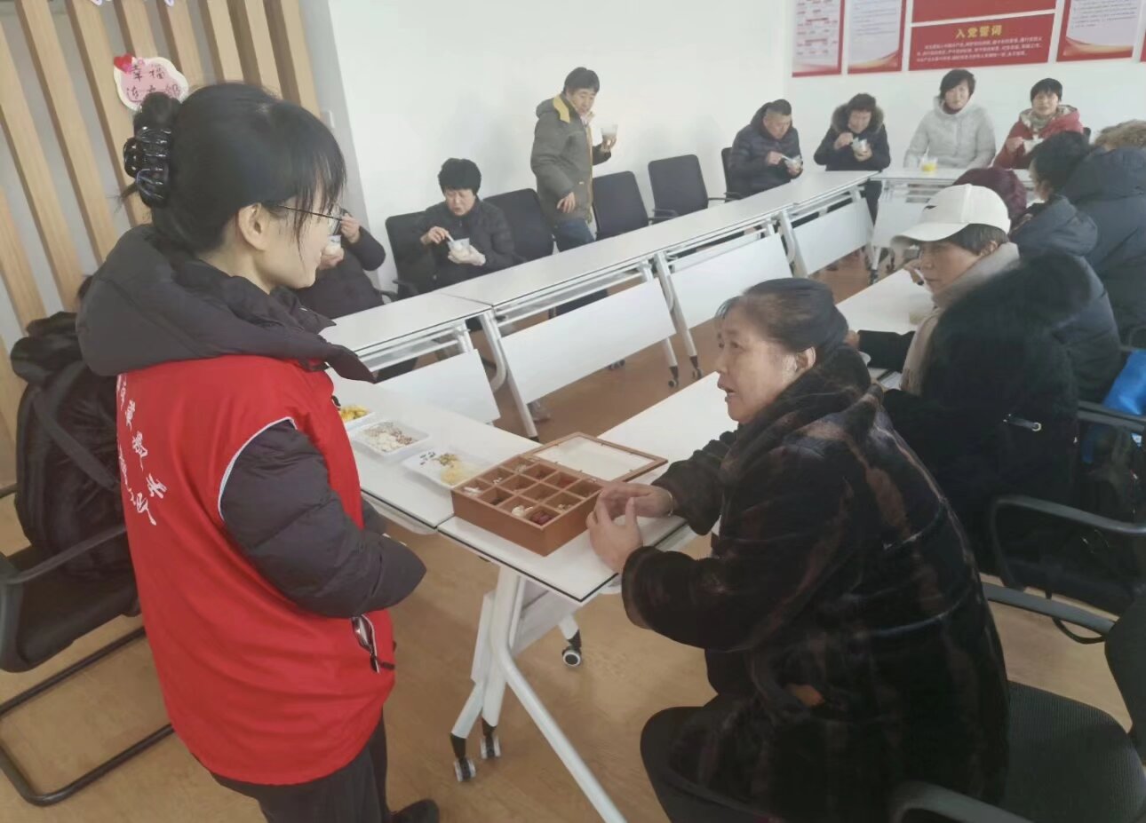 粥香氤氲中,文化传承同步升温。活动室一角,队员们摆放着分装红豆、绿豆、小米等食材的多格拼盒,向居民讲解每种食材的寓意:红豆象征 “鸿运当头”,桂圆代表 “团团圆圆”,小米寓意 “岁岁平安”。一位穿深色皮袄的老奶奶听得津津有味,不时拨弄着食材,分享自己年轻时熬粥、腌腊八蒜的趣事,代际间的文化共鸣在交流中悄然生发。背景墙上 “入党誓词” 的红色展板格外醒目,让传统节俗与红色文化在此和谐相融。
