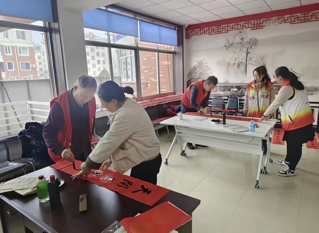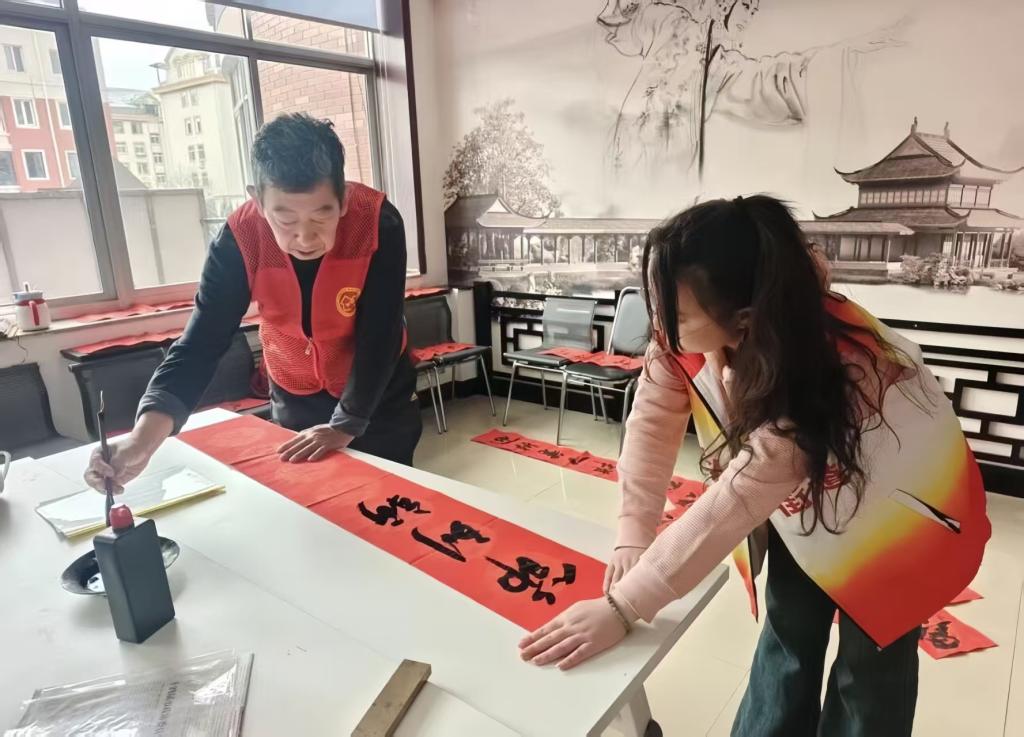 “天增岁月人增寿,春满乾坤福满门”“平安如意千般好,富贵吉祥万事兴”,一幅幅寓意吉祥的春联跃然纸上,苍劲有力的行楷、飘逸洒脱的行书搭配喜庆的红纸,让传统文字焕发别样生机。实践小组的同学们各司其职、忙而有序:有的稳稳扶纸,配合书法爱好者调整书写角度;有的细心协助晾干墨迹,避免春联受损;有的主动为居民递送写好的春联与福字,耐心询问需求。来自社区的李大爷接过刚晾干的 “福” 字,脸上满是笑容:“手写的春联就是不一样,有温度、有墨香,贴在家里才叫过年,这才是咱们中国人的年味儿!”