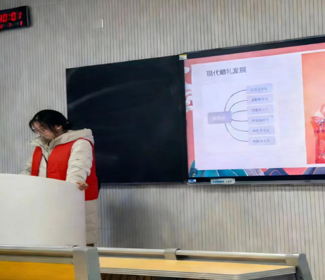 活动当天,实践队员提前1小时到校布置教室,将历史文物图片、互动游戏道具有序摆放。课堂上,队员们以“婚礼的演变流程”为切入点,用通俗语言讲解婚礼文明的历史脉络,配合漫画卡片让学生直观感受文物背后的故事;在素质拓展环节,通过“历史人物角色扮演”等互动形式,让学生在参与中理解家国情怀。课堂间隙,队员们还为学生辅导作业,解答历史学科疑问,记录下学生们专注投入的瞬间。