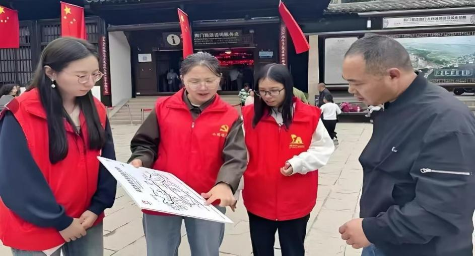 针对家庭游客较多的特点,队员们特别准备了“三国小知识”问答互动,用“赵云的坐骑叫什么”“诸葛亮发明的运输工具是什么”等趣味问题,让孩子们在游览中收获知识。遇到老年游客,队员们主动搀扶引导,详细讲解无障碍通道位置与休息区分布;看到有游客在红墙夹道处拍照时跨越护栏,队员们立即上前温和劝阻,并示范文明拍照的正确方式。