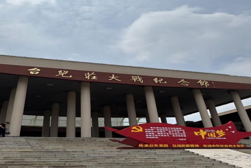 台儿庄大战纪念馆坐落于古运河畔,以庄严肃穆的建筑风格与厚重详实的展陈内容,成为承载抗战记忆、传播红色文化的重要载体。踏入纪念馆前,实践队员驻足于门前“传承红色基因、弘扬民族精神”的红色雕塑前,仰望着“台儿庄大战纪念馆”的金色题字,柱廊撑起的庄重檐角与运河流水相映,一股跨越时空的历史厚重感油然而生。