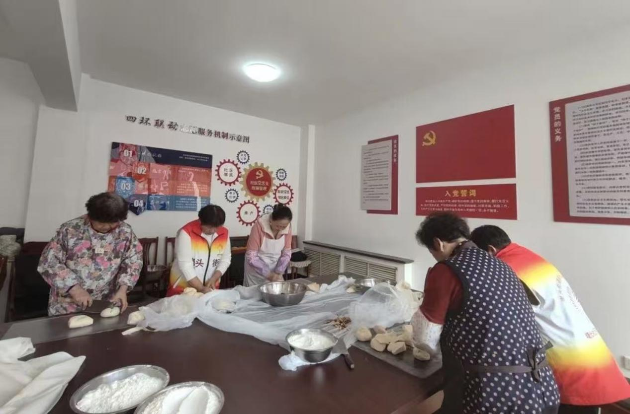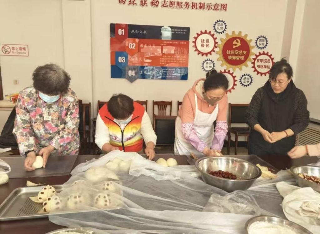 本次寒假社会实践,“青史润社区”实践队紧紧围绕社区服务核心主题,立足社区居民生活需求与新春民俗文化传承,开展了形式多样、贴近民生的志愿服务活动。活动现场,社区党群服务中心内布置温馨,墙上“四环联动志愿服务机制示意图”“入党誓词”等标识醒目庄严,处处彰显着基层治理的温度与红色文化的底色。队员们身着统一的志愿服装,与社区工作人员、老年居民代表围坐在长桌旁,一同揉面、塑形、制作传统花馍与面食,在欢声笑语中拉开了志愿服务的序幕。