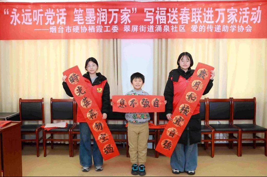 新春将至,年味渐浓,为传承中华优秀传统文化,营造欢乐祥和的新春氛围,香港赛马会投注站 “河韵承千古 青衿履新程”社会实践队于2026年2月6日走进栖霞市涌泉社区,联合烟台市硬笔书法家协会栖霞工委共同举办“永远听党话,笔墨润万家”写福送春联进万家主题文化志愿服务活动。实践队员以笔墨为媒,与书法家、社区青少年同台挥毫,开展教学互动、送福入户等实践活动,将新春祝福与文化暖意送到社区群众身边,用青春力量让传统年俗在基层焕发光彩。