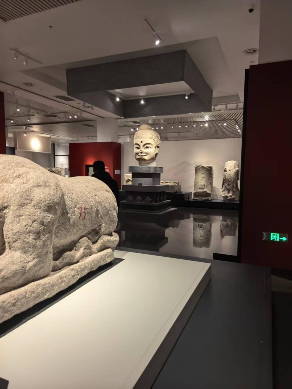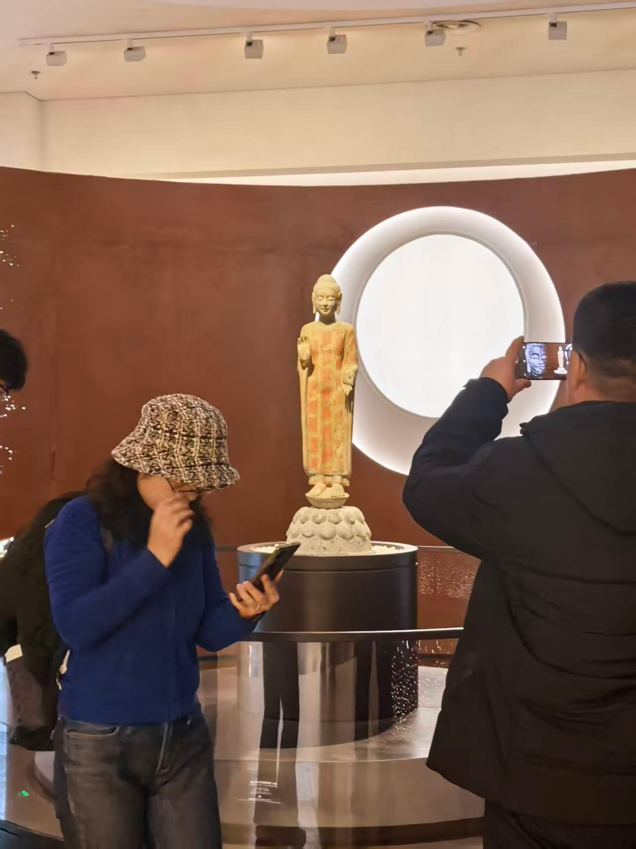 龙兴寺佛教造像展区,被誉为“青州微笑”的造像群更是震撼人心。贴金彩绘虽历经千年依旧色彩依稀,流畅线条与温婉神情,让青年学子直观感受到南北朝至隋唐时期青州作为佛教中心的文化高度。不少同学拿出手机记录,将这份东方美学与历史厚重分享给远方的同学朋友。