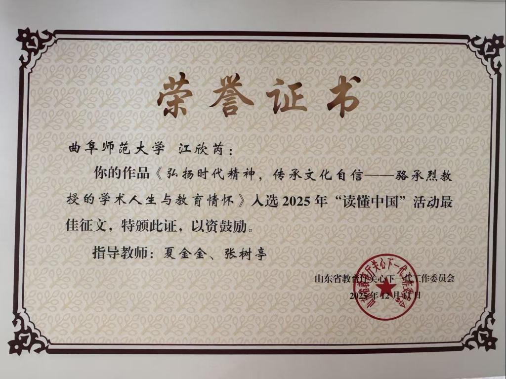 其中,吕文轩同学撰写的《九旬鸿儒心向党,七秩杏坛铸国魂》成功入选教育部优秀征文;江欣芮同学撰写的《弘扬时代精神,传承文化自信——骆承烈教授的学术人生与教育情怀》荣获山东省教育厅最佳征文。