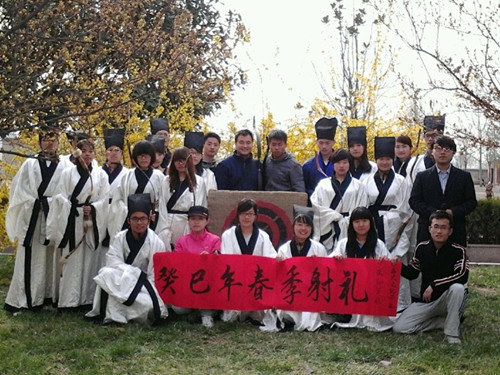 作为孔子文化月的特色活动之一,本次射礼以“君子不争,必也射乎”为主题,共分为备礼、迎宾、开礼、配耦、纳射器、倚旌、三番射、送宾等环节,活动中,老师及学生身着儒服,现场模拟古时宾射礼仪。宾至,主人迎上,相互行揖礼入场登堂而立;开礼,司射自堂西取弓及箭,请射于宾;宾射毕,进行三轮射;众人射毕,送宾,所有参礼人员相互行揖礼告别。活动现场气氛十分热烈.