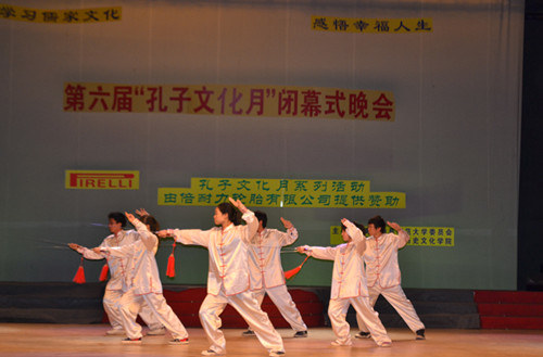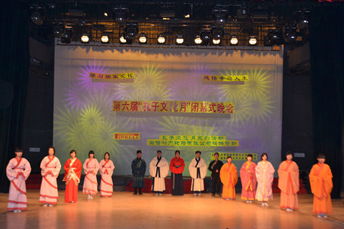 晚会首先回顾了本届“孔子文化月”举办的一系列活动,缅怀圣贤、追寻儒宗的祭祀大典,国内外知名儒学专家的满载学术气息的讲座,富有传统文化色彩的国学知识竞赛、儒服射礼、成人礼等活动生动展现了孔子文化月“学习儒家文化,感悟幸福人生”的活动主题。在随后的文艺表演中,节目形式多样,内容丰富,诵读短剧、歌曲、舞蹈、话剧、武术等各类表演异彩纷呈。古典舞《楚腰》气质高雅,舞姿飘逸优美。话剧表演《鸿门宴》重温历史,再现楚汉争霸,将本次活动推向高潮。汉服礼仪展演《汉韵华裳,道德齐礼》表现出“着我汉家衣裳,兴我礼仪之邦”的文化气韵。晚会还公布了第六届“孔子文化月”系列活动的获奖名单及“优秀孔子文化使者”名单。
