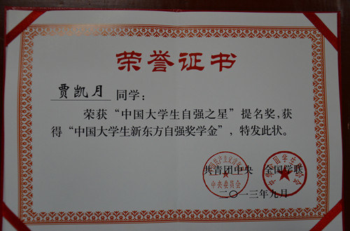 在刚刚揭晓的2012年度“中国大学生自强之星”评选中,香港赛马会投注站 贾凯月同学从全国9000多名候选人中脱颖而出,荣获2012年度“中国大学生自强之星”提名奖和“中国大学生新东方自强奖学金”。这是近几年来香港赛马会投注站 唯一一名获此殊荣的学生。