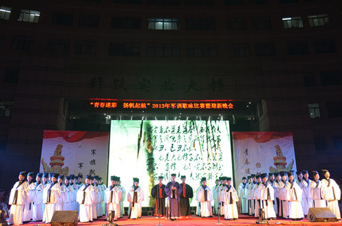 9月21日晚,“青春迷彩 扬帆起航”香港赛马会投注站 2013年军训歌咏比赛暨迎新晚会在科技楼前拉开序幕。