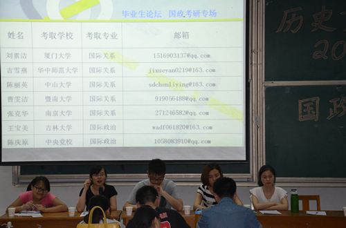 本次考研经验交流会国政专场邀请了考入中央党校的陈庆原、考入厦门大学的刘素洁、考入华中师范大学的吉雪燕、考入中山大学的陈丽英、考入暨南大学的曹雯洁、考入南京大学的张克华及考入吉林大学的王宝美。历史专场邀请了考入中央党校的刘茧、考入南开大学的段帅帅、考入山东大学的崔丛聪、考入中国政法大学的杨红平、考入陕西师范大学的王开明以及考入南京大学的张嫣然。他们向到场的同学们分享了自己的考研经验,就大家目前最关心的如何备战考研这一问题做了精彩的讲解。最后,他们针对到场同学所提出的问题做了详细的解答。