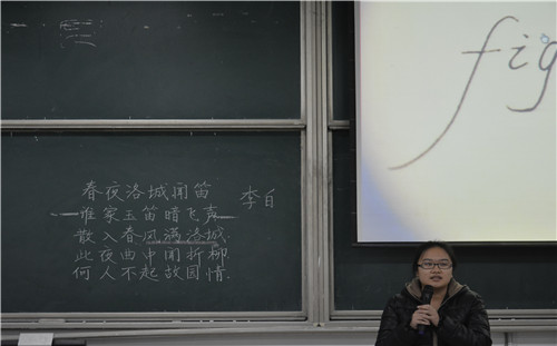 经过初赛的激烈角逐,共有16位选手晋级决赛。比赛共有“现场展示”和“我看诗文”两个环节,在选手进行粉笔字书写展示的同时,大屏幕上将播放选手的PPT风采展示,后由选手对自己的作品进行介绍,两环节同时进行。评委对选手两个环节的表现进行了打分,最后朱乐朋教授从字体结构、章法布局等方面对选手们的作品进行了专业的点评。
