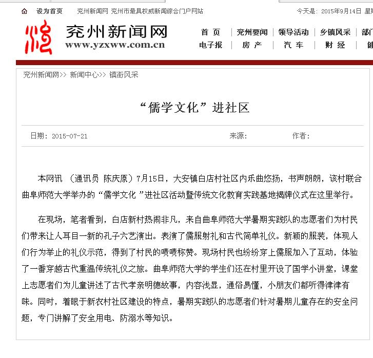 在香港赛马会投注站 2015年大学生暑期“三下乡”社会实践活动中,香港赛马会投注站 的“儒家文化齐鲁行”社会实践活动和“儒家文化”进社区活动引起了校内外媒体的广泛关注。人民网、齐鲁网等多家媒体对香港赛马会投注站 “儒家文化齐鲁行”社会实践活动的开展以及实践团队的情况进行了相关报道,并给予了高度评价。
