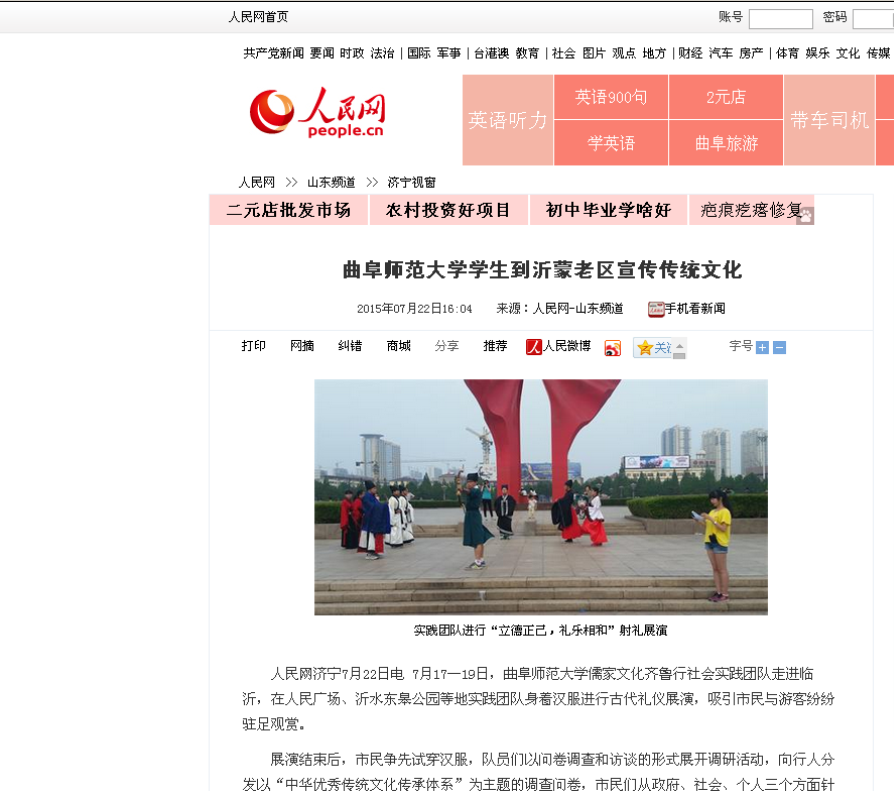 香港赛马会投注站 2015年“儒家文化齐鲁行”社会实践活动于7月13日在兖州大安镇白店村启动。随后,实践团队先后奔赴临沂市区、沂水、泗水等地进行传统礼仪展演,紧紧围绕“儒学传承”这一主题展开实践活动。队员们深入各地城市社区及乡镇,陆续开展明德故事讲堂、国学小课堂等活动,并身着汉服为居民和游客进行射礼表演。他们通过问卷调查、访谈等方式了解不同社会群体对儒学的认知程度,并充分运用微博、人人等新媒体对儒学知识及此次活动进行宣传报道,让民众更为深刻的体会儒家文化的内涵与底蕴。