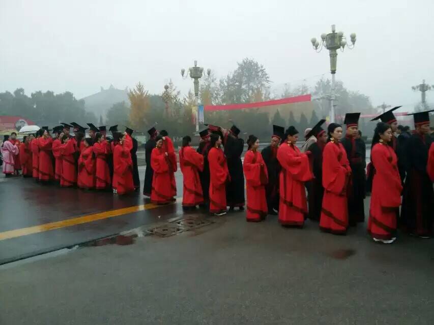 11月21日,由曲阜团市委、市文明办、市民政局联合举办的第二届百姓儒学节之汉式集体婚礼在蓼河人工湖广场成功举行。
